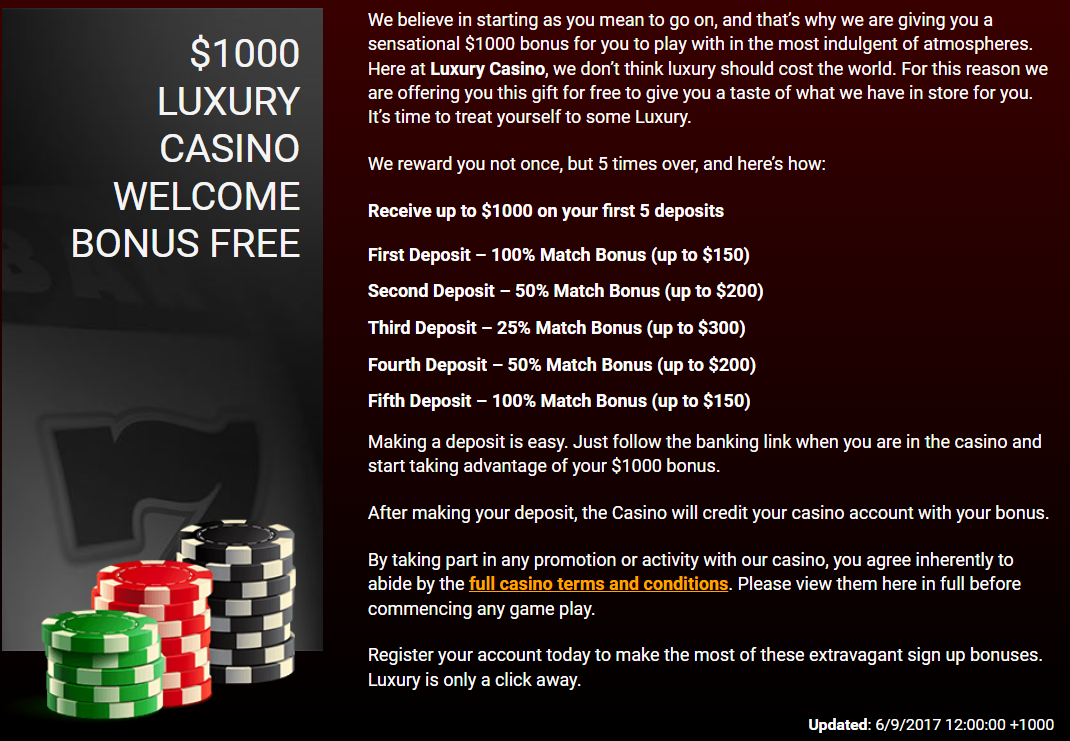 Luxury Casino offers a generous $1,000 Welcome Bonus over the first five deposits. The bonuses are structured to provide maximum value for new players. Here’s a detailed table of the bonuses included in the welcome package: