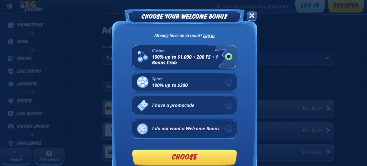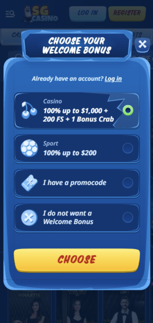 The welcome bonus at SG Casino is an attractive offer. New players can claim a 100% match bonus up to $1,000, 200 free spins, and an exciting 1 Bonus Crab reward.