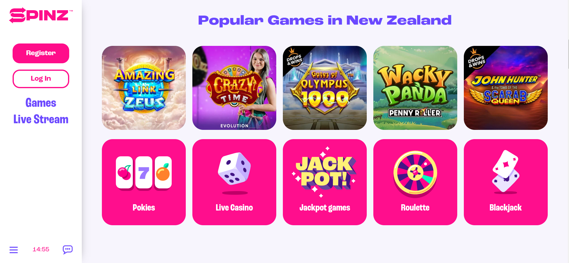 Spinz Casino boasts a wide variety of slots, including high-RTP games and popular themes: