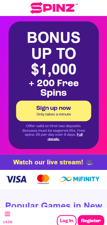 Spinz Casino has a clean and simple interface that works well. With more than 2,000 games, the platform makes it easy to get around, whether you’re looking through the huge library of games, managing transactions, or claiming promotions. The design of the casino includes flexible layouts and catchy graphics that make the betting experience more engaging.