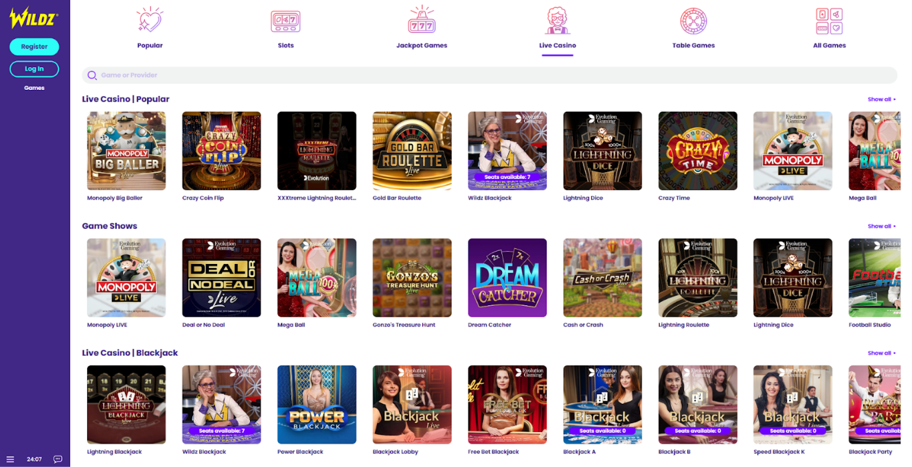 Wildz Casino has a powerful live casino area driven by Evolution Gaming and Pragmatic Play for those seeking a more immersive gaming experience. These live dealer games provide a genuine and interesting experience that very nearly reflects visiting an actual casino.