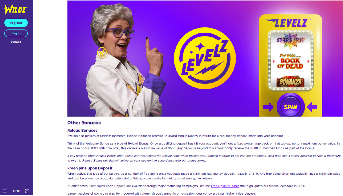 Wildz offers frequent cashback deals, reload bonuses, and free spins for returning players.