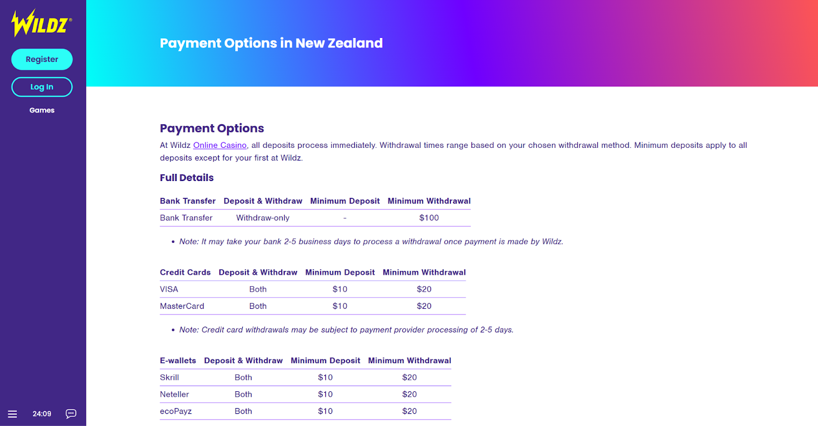 For some players, though, the lack of a specific mobile app and limited banking options could be disadvantages. Wildz still impresses with its large game library, live dealer experiences, and for its obvious safety.