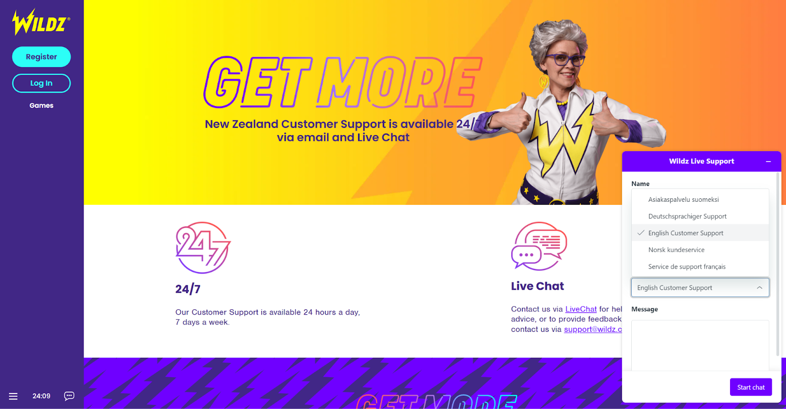 Wildz Casino offers email and live chat customer support. Although there isn’t a specific phone number for assistance, live chat provides fast and effective answers to most problems.